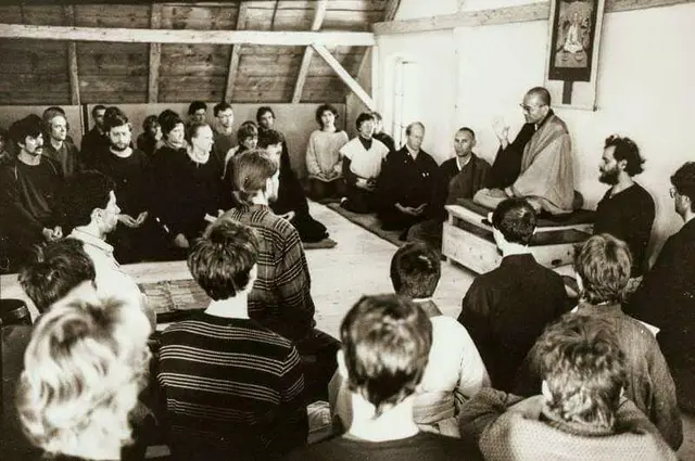Sessin Przesieka, Stary M艂yn, 1987. Mowa Dharmy Roshi Maezumi. Dziukai z Genpo, wtedy Sensei.